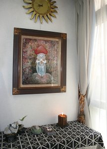 リーディングルームの正面を飾る絵は大黒天。人とのご縁・繁栄などを司る神様です。